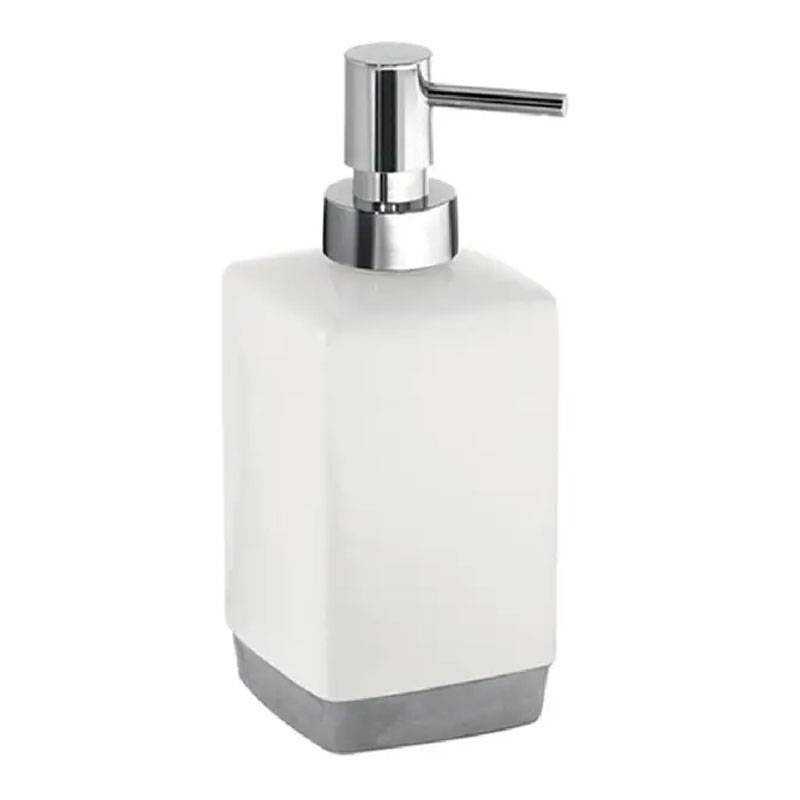 - 1 Distributeur de savon liquide sur pied blanc, en céramique blanche et base chromée, avec distributeur en résine chromée, dimensions : 7,3x7,3x17,5cm
