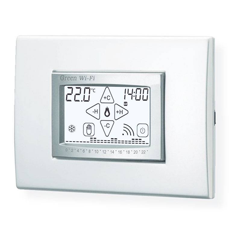 Green Wi-Fi est équipé d'un écran rétro-éclairé avec visualisation graphique des températures, modifiables à l'aide de commandes simples et fonctionnelles qui facilitent la programmation. Green Wi-Fi permet de contrôler les systèmes de chauffage et de refroidissement. Il évite le gaspillage d'énergie en faisant fonctionner le système de chauffage ou de refroidissement uniquement lorsque cela est nécessaire.