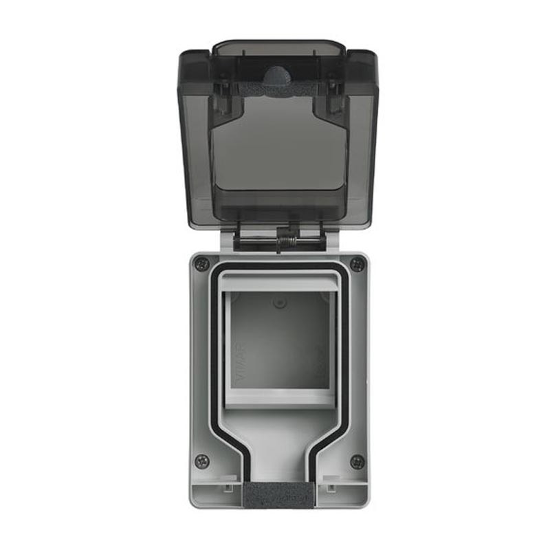 Boîtier Vimar mural étanche avec fiche insérée, 2 modules. Elle permet l'installation de 2 modules de la série civile Eikon, Arké ou Plana. Degré de protection IP66 garanti même avec la fiche insérée.