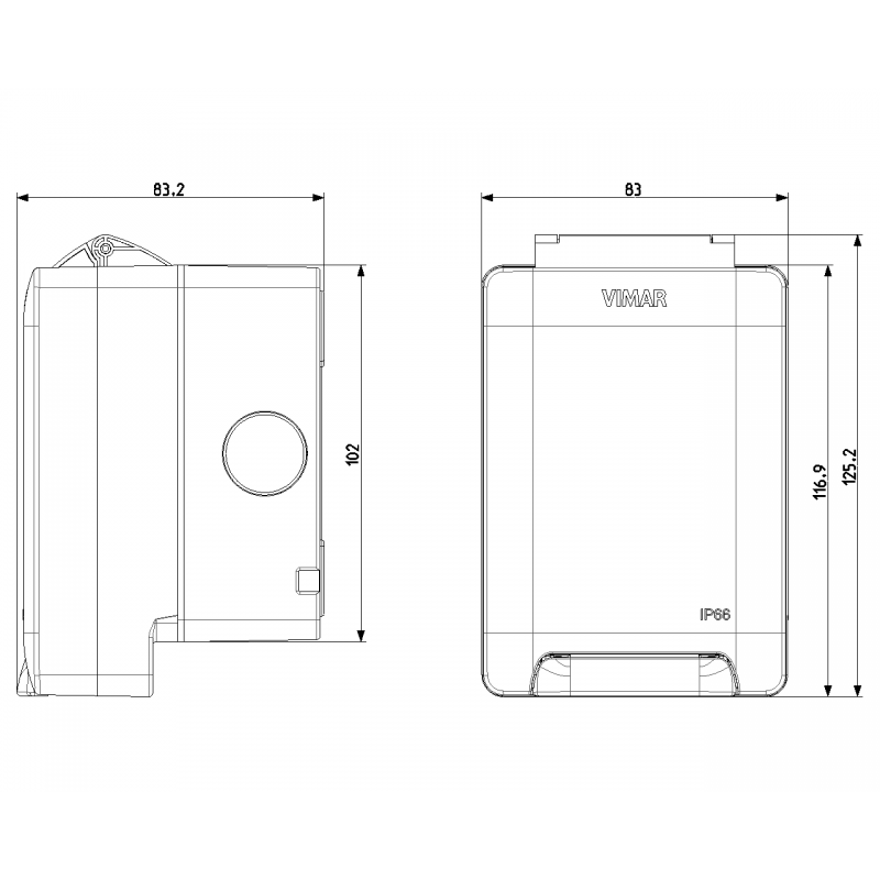 Boîtier mural Vimar boîte étanche + prise SICURY 2P + T 16 A 250V, 2 modules. Degré de protection IP66 avec fiche insérée, blanc.