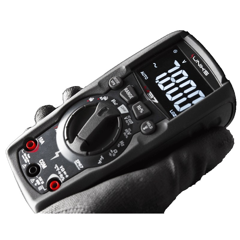 Multimètre en auto-range et TRMS courant 10A Uniks avec température, représente la gamme UNIKS de multimètres numériques de petites dimensions mais avec des caractéristiques de mesure et de construction de haut niveau.