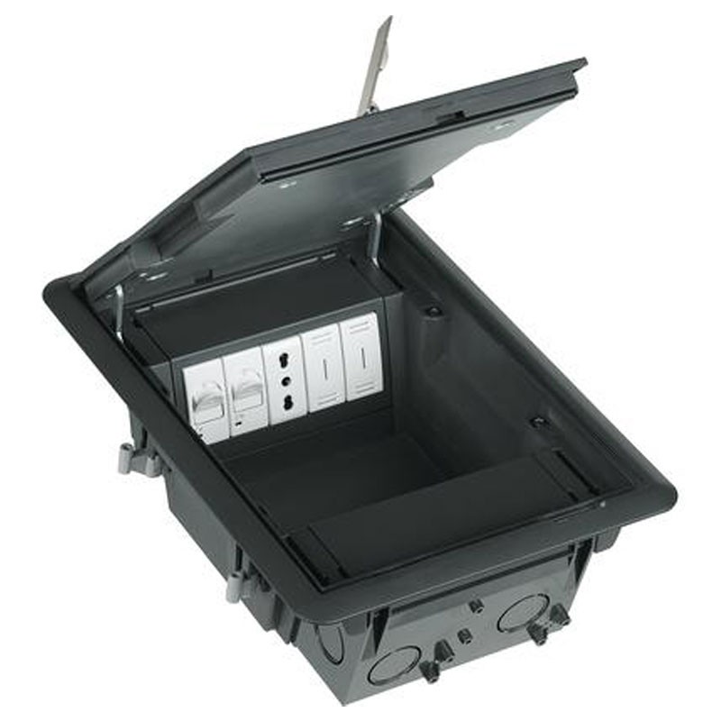 Tourelle cachée Bticino, capacité 8/10 modules. Couvercle avec finition antidérapante en acier inoxydable et poignée ergonomique. Dimensions : Hauteur 92,5 mm - Largeur 185 mm - Profondeur 270 mm.