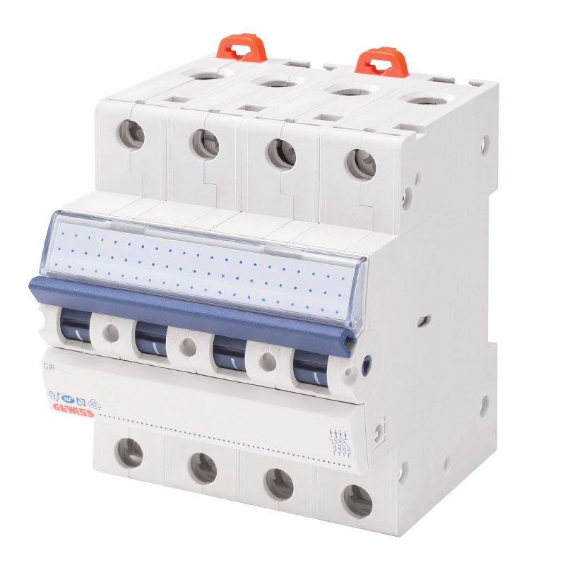 Disjoncteur magnétothermique Gewiss 63A 4P 6KA C 4 modules avec les caractéristiques suivantes :