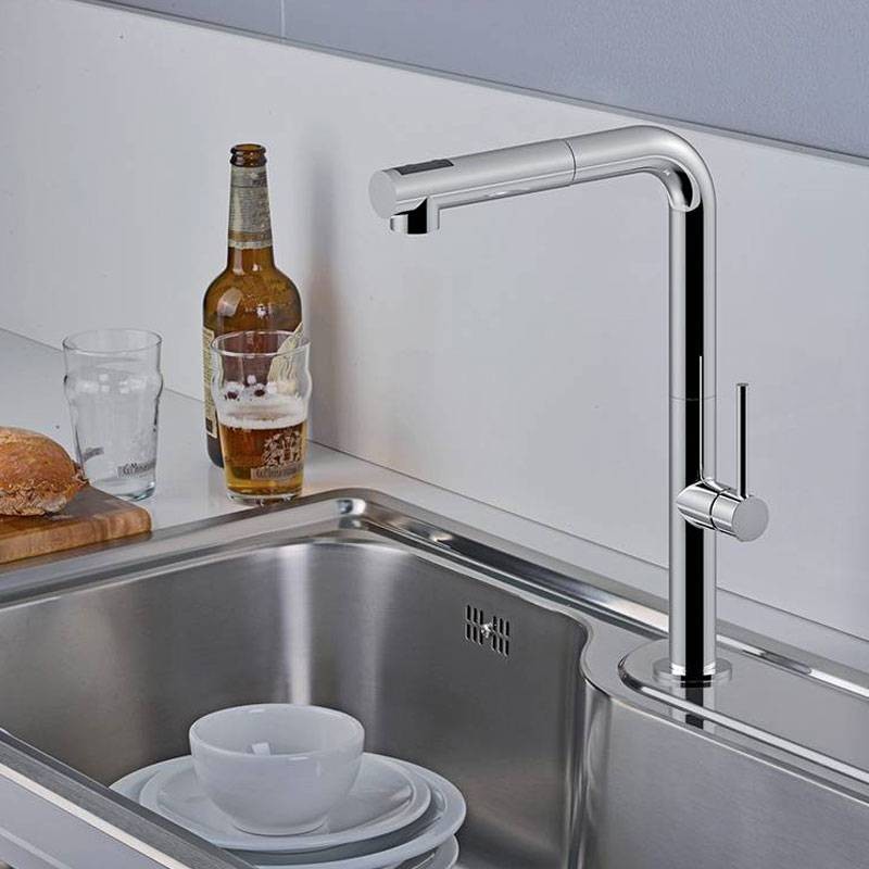 Mitigeur d'évier Paffoni Chef avec douchette chromée extractible à 2 jets avec les caractéristiques suivantes :