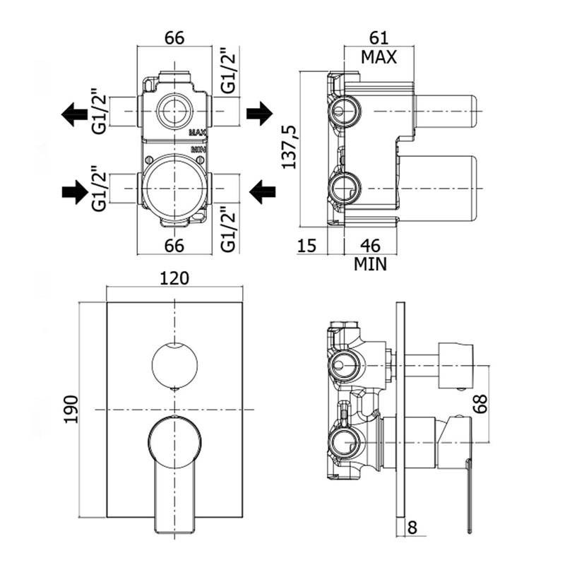 Mitigeur encastré pour douche Paffoni Tango 2 sorties chromé avec les caractéristiques suivantes :