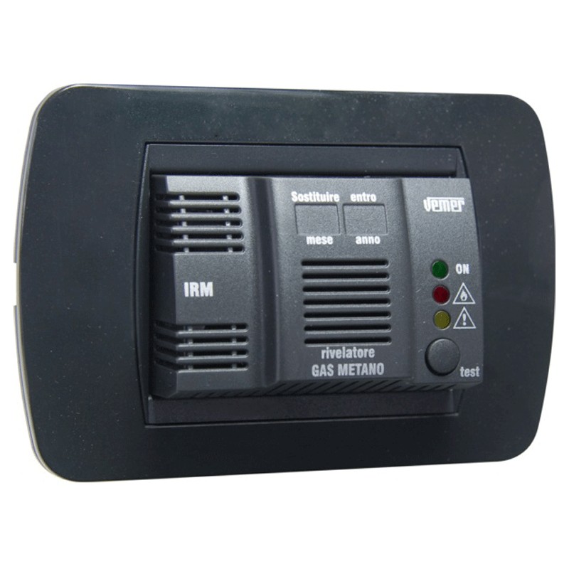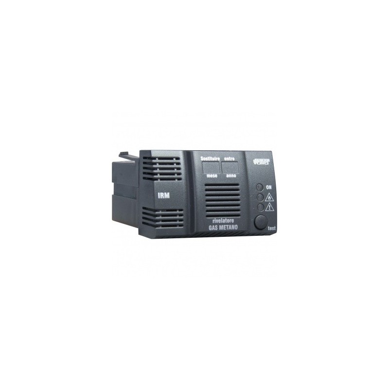 Détecteur de gaz méthane Vemer avec un relais pour électrovanne. Détecte la présence d'une fuite de gaz méthane, et par l'intermédiaire d'un relais ferme le robinet du compteur de gaz. Compatible avec Bticino,Vimar,Gewiss et Ave. Alimentation 230 v,alarme de signalisation par led et buzzer.