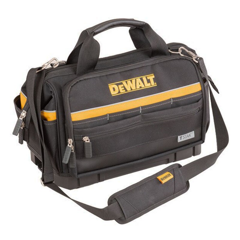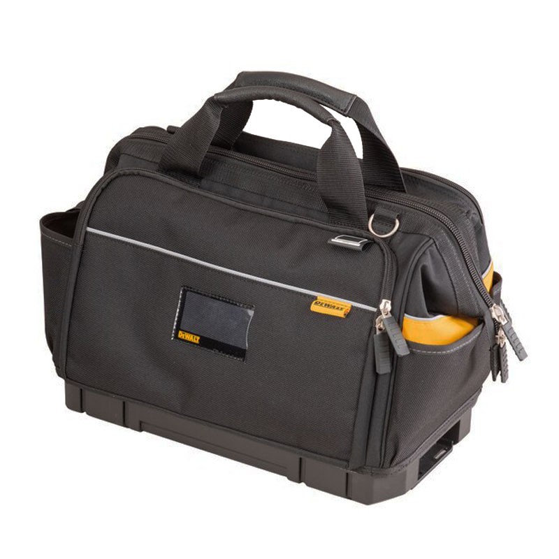 Sac à outils DeWALT en polypropylène imperméable avec base rectangulaire. Construction en nylon 600x1200 Den, multiples poches intérieures et extérieures, diviseurs amovibles et espace suffisant pour les outils électriques et les batteries.