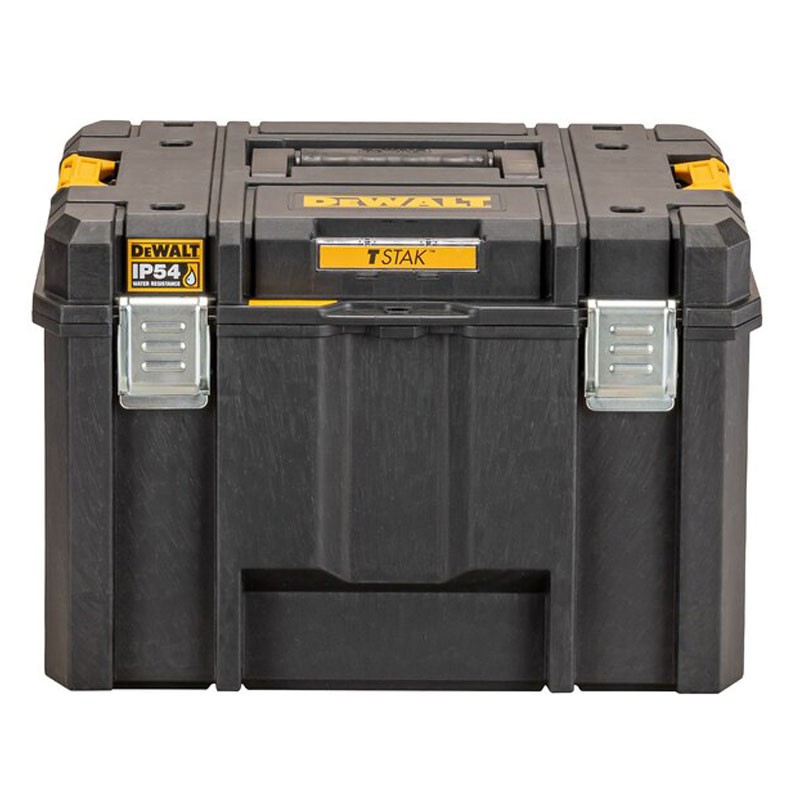 Mallette à outils DeWALT TSTAK IV avec plateau à outils amovible, charnières pour fixation latérale. Avec des charnières de verrouillage en métal et un joint contre l'humidité et la poussière (IP54).