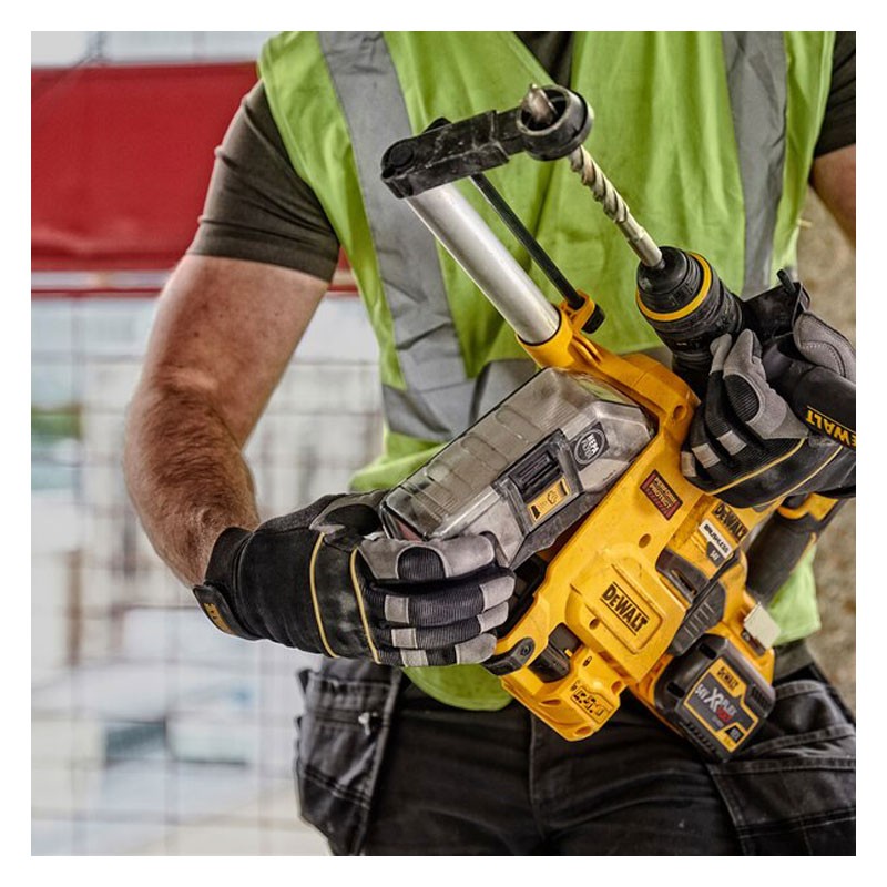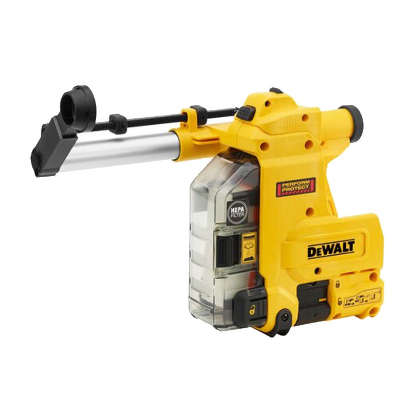 Système d'extraction des poussières pour la clé à chocs DeWALT SDS-Plus avec filtre HEPA, perçage sans poussière jusqu'à 26 mm de diamètre maximum et 180 mm de profondeur maximum.