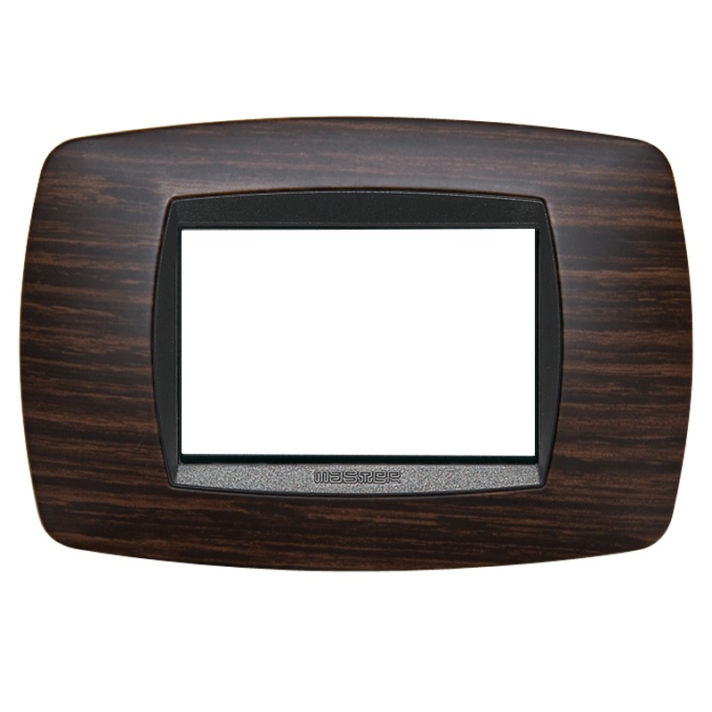 Plaque Master Modo 3 modules (fruits, lieux) en technopolymère, couleur wengé effet bois. La plaque se monte sur les supports 38003, 38003-F, ou par l'intermédiaire de l'adaptateur 39033 la plaque est compatible avec les supports LN4703 et L4703 Bticino série Living et LivingLight.