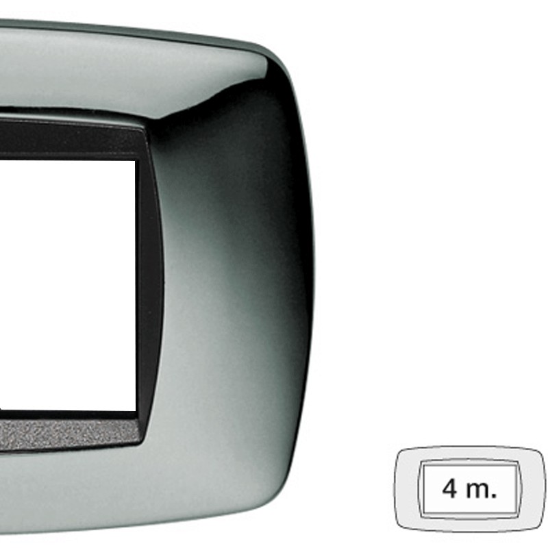 Plaque Master Modo 4 modules (fruits, places) couleur chrome. La plaque se monte sur les supports 38004, 38004-F, ou par l'intermédiaire de l'adaptateur 39034 la plaque est compatible avec les supports LN4704 et L4704 des séries Bticino Living et LivingLight.