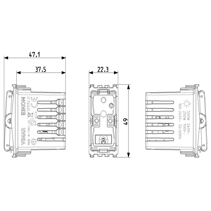 - Bornes : - 2 bornes (L et N) pour la ligne et le neutre - 1 borne (P) pour la connexion à la télécommande à fil (ex. art. 20008-19008-16080-14008). La distance maximale entre le dispositif IoT et le bouton-poussoir est de 50 m avec un câble de section minimale de 1,5 mm2 - 2 bornes (1 et 2) pour la sortie du déviateur