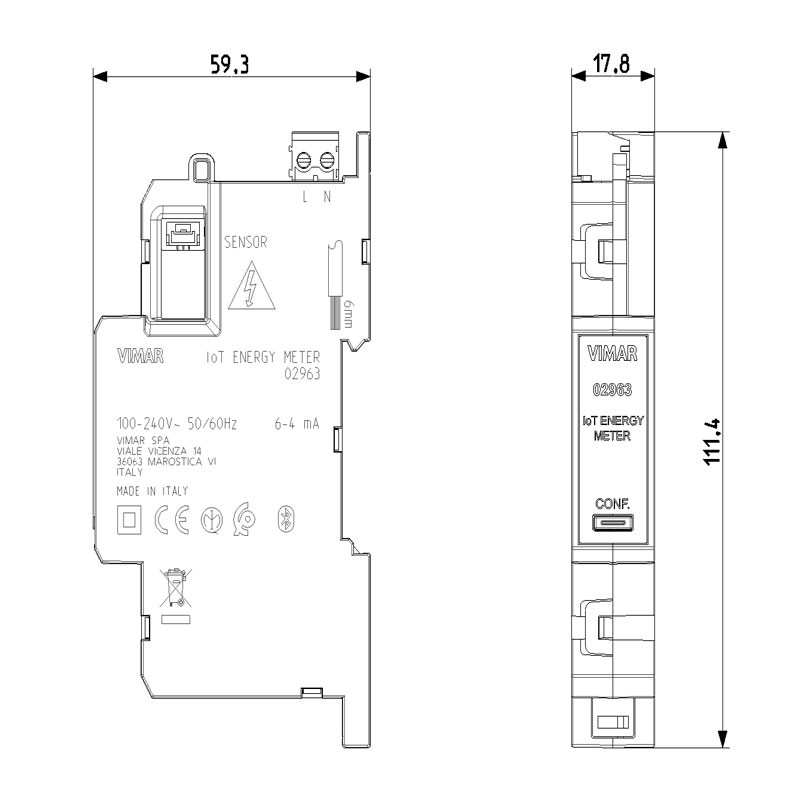 Compteur d'énergie connecté monophasé Vimar IOT pour mesurer la consommation et la production d'électricité instantanée et historique (avec une résolution horaire, quotidienne, mensuelle, annuelle) :
