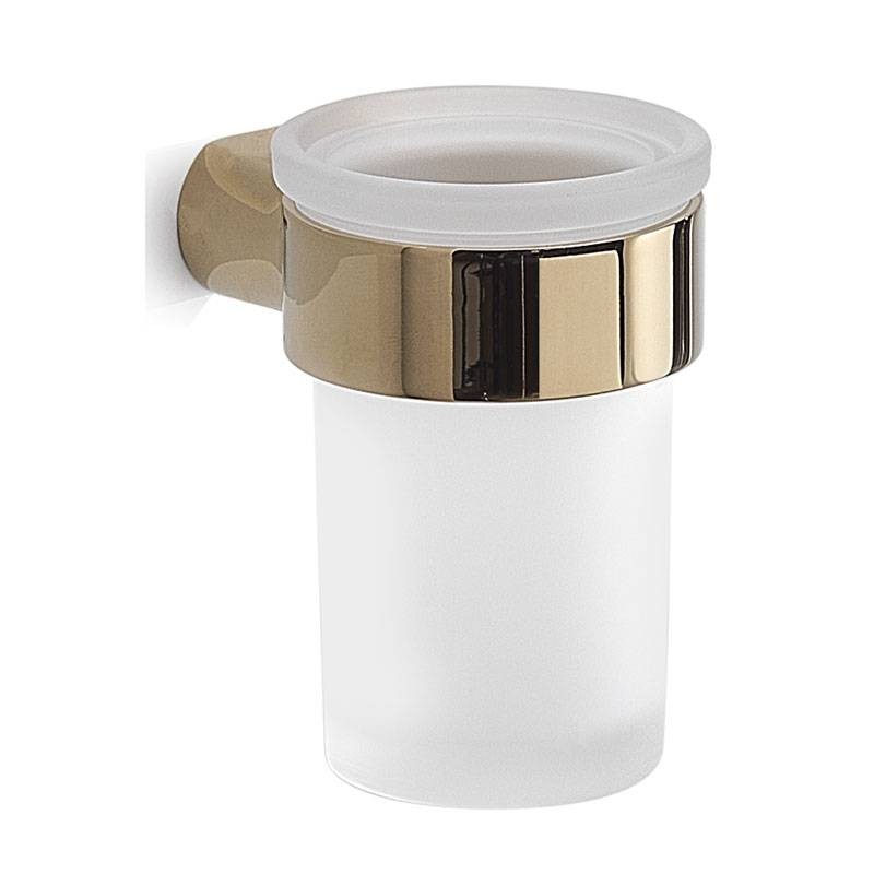 Porte-brosse à dents mural Gedy Pirenei en acier inoxydable et cromall, avec récipient en verre dépoli, couleur or poli, dimensions 6,9x9,2x10,4cm.