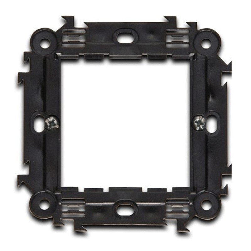 Support Master en polycarbonate avec clips, 2 modules universels, appartenant à la ligne civile 'Modo' et 'Mix'. Ce support est adapté aux boîtes d'encastrement rondes d'un diamètre de 60 mm, et permet de fixer uniquement les plaques Modo et Mix Master. Les supports sont fixés aux boîtes d'encastrement au moyen de vis, permettant le montage de plaques de la série correspondante.