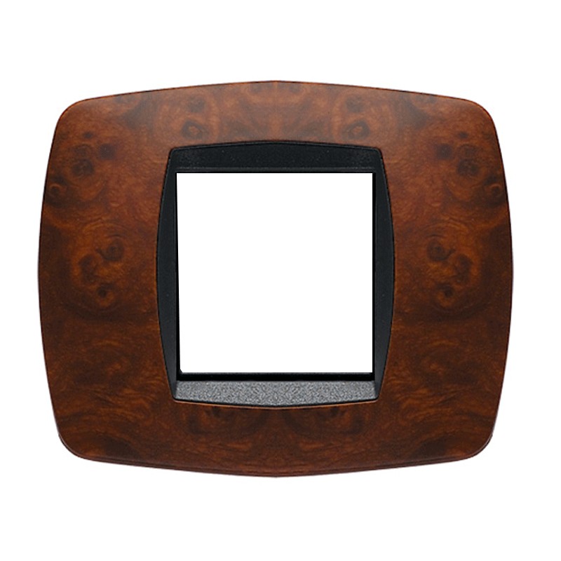 Plaque Master Modo 2 modules (fruits, lieux) couleur noyer racine. La plaque se monte uniquement sur le support 38020-I. Fabriqué en technopolymère.