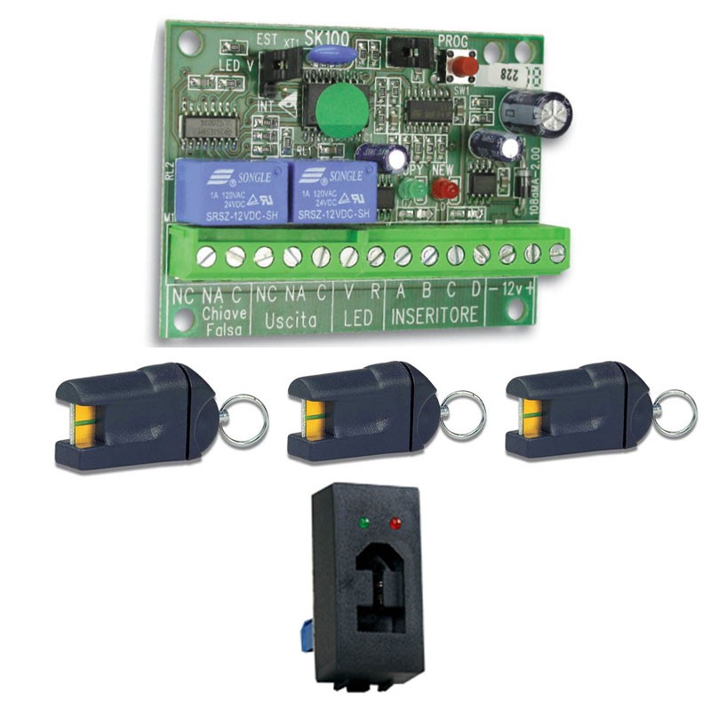 Kit clé électronique à microprocesseur composé de 1 carte de traitement SK100, 3 clés SK, 1 inserteur SKI/NLA Tessin série International.