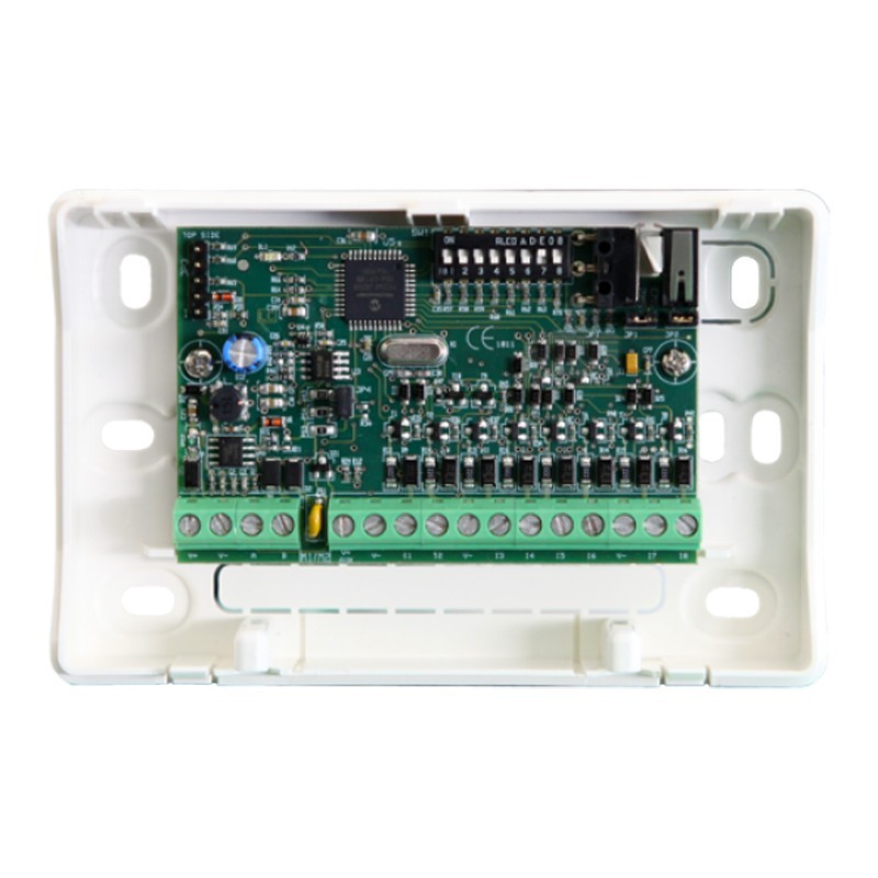 Extension Comelit pour centrales série Vedo, 8 entrées, librement configurables comme NC, NO, simple, double, triple équilibrage et double, ou 8 sorties open collector (100 mA max).