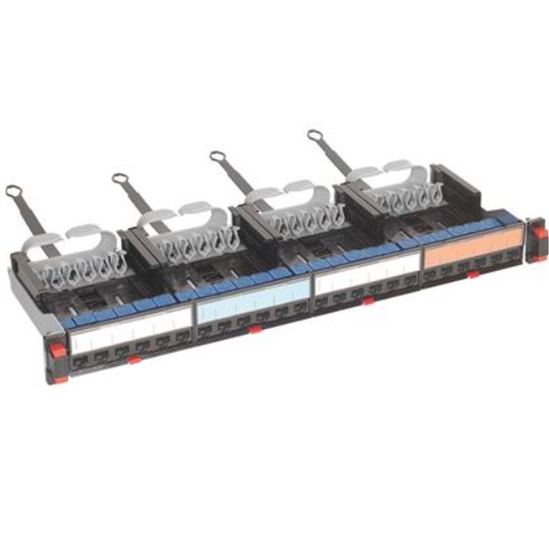 - Equipé de 4 cassettes de 6 connecteurs LCS3 RJ45 Cat. 5E à connexion rapide sans outils, marqués 568 A/B