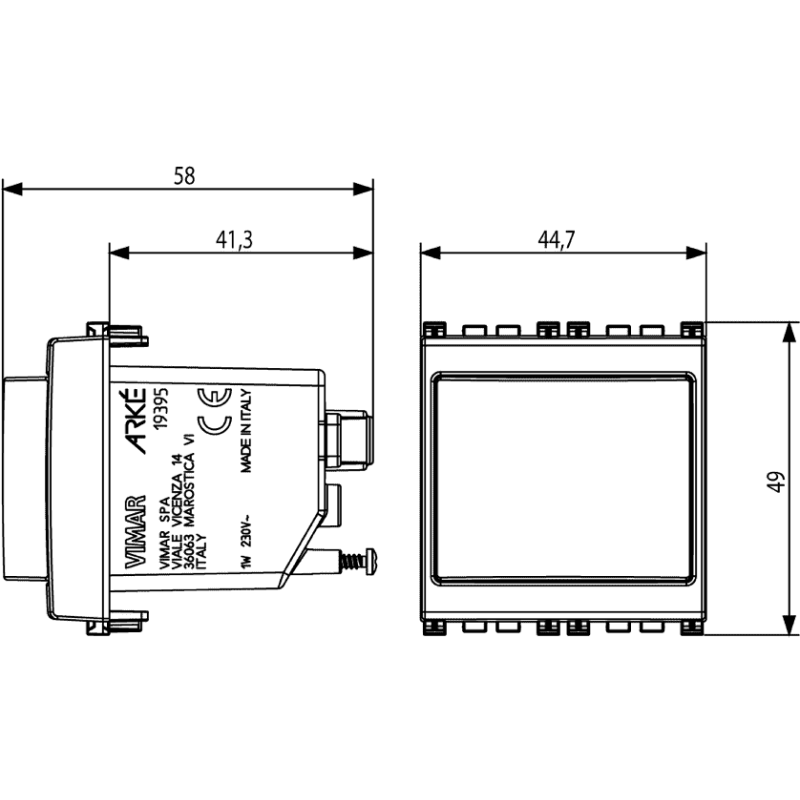 Torche Vimar Arke torche électronique portable avec LED à haut rendement 230V 50-60 Hz, dispositif automatique d'urgence, 2 modules. Batterie Ni-MH rechargeable et remplaçable, autonomie 2 heures, couleur gris. Ce module se monte sur les supports 19613, 19614, 19617.