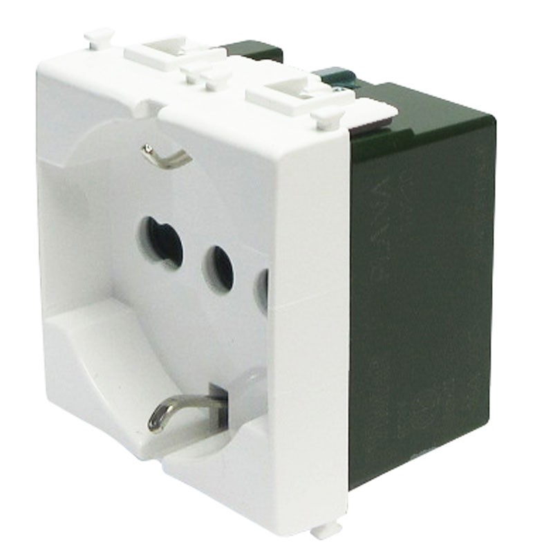 Vimar prise électrique universelle schuko 2P+E 16A 250V fréquence 50.00 - 60.00 HZ, couleur blanc. La prise électrique schuko, également appelée prise allemande, peut être équipée de n'importe quel type de fiche (petite, grande et schuko). Capacité 2 modules, degré de protection IP20. Matériau : plastique. Dimensions : largeur 44,80 mm, hauteur 49,00 mm, profondeur 25,00 mm.