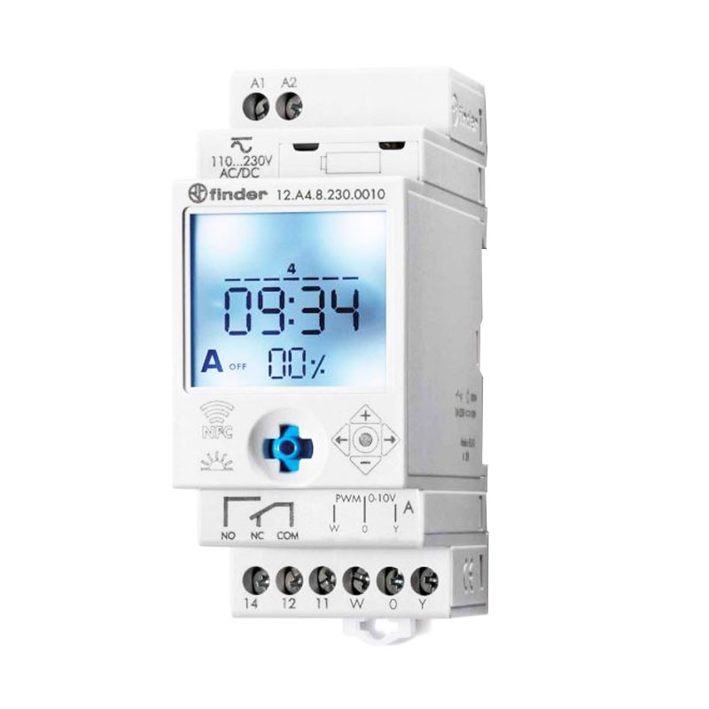 Interruttore orario astronomico Finder settimanale PWM 0-10V 2 moduli, ideale per attuare una regolazione a tempo programmata di luci in contesti come: vetrine, negozi, cartelloni pubblicitari, ecc.