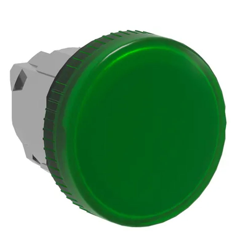 La testa verde a gemma liscia Harmony XB4 di Schneider Electric per lampada spia è fornita con base BA9s. Ha una forma rotonda e una ghiera metallica cromata.