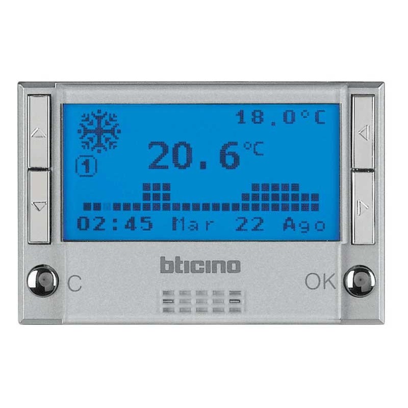 Il cronotermostato collegato alla caldaia o climatizzatore serve per programmare l'accensione e lo spegnimento e anche la temperatura desiderata. Cronotermostato da incasso giornaliero/settimanale per riscaldamento e condizionamento.