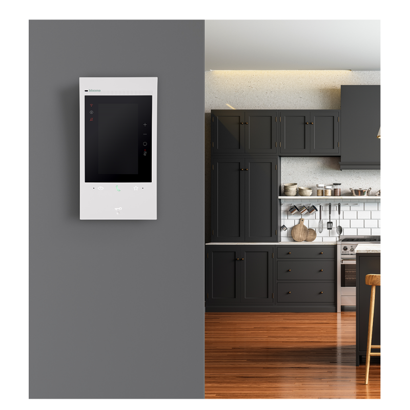 Verticale e sottile, estetica pulita e moderna, profilo curvo ed un design distintivo che risponde perfettamente alle esigenze del vivere contemporaneo. Il display touch verticale e la funzione di riconoscimento facciale, garantiscono una perfetta visualizzazione e la centratura automatica del chiamante sullo schermo.