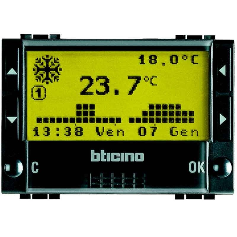 Cronotermostato incasso (in qualsaisi scatola 3 posti) Bticino colore antracite. Il cronotermostato collegato alla caldaia o climatizzatore serve per programmare l'accensione e lo spegnimento e anche la temperatura desiderata.