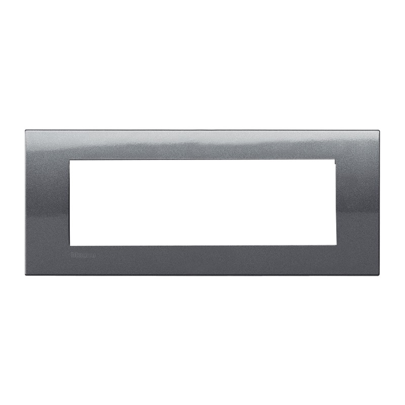 Placca Quadra 7 moduli (frutti,posti) Bticino LivingLight colore acciaio. Può essere installata solo supporto LN4707. La placca non si installa su altre serie Bticino ma solo su LivingLight.