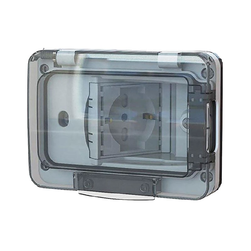 Custodia 4Box WIDE con presa Schuko, colore Bianco, , con sportello apribile a cerniera, con grado di protezione IP55 anche con spina inserita e sportello chiuso. Compatibile con Vimar Plana, Gewiss Chorus.