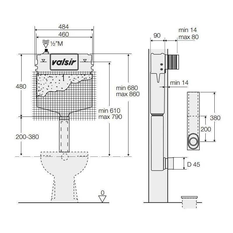 È studiata per l'installazione in pareti a basso spessore in mattoni o in legno con vaso WC a terra. Il tubo di cacciata permette la regolazione di 20 mm verso l'alto o verso il basso per correggere eventuali errori di quota una volta completata la pavimentazione.