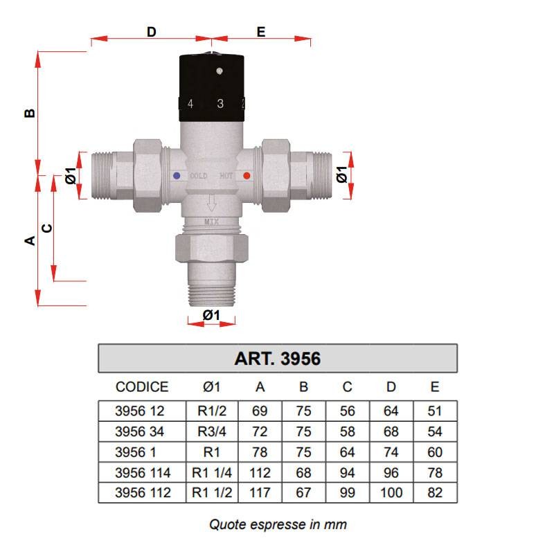 - Miscelatore termostatico, per impianti sanitari, in ottone cromato, con attacchi maschio da 1/2"-3/4-1"-1"1/4-1"1/2 completi di bocchettoni e guarnizioni, manopola di regolazione, in ABS, provvista selettore numerato da 1 a 5 corrispondente ad un campo di regolazione 30÷65°C e dispositivo di bloccaggio della temperatura, funzione antiscottatura, elemento termosensibile a cera. Temperatura max in ingresso 95°C. Pressione max di funzionamento 10 bar.