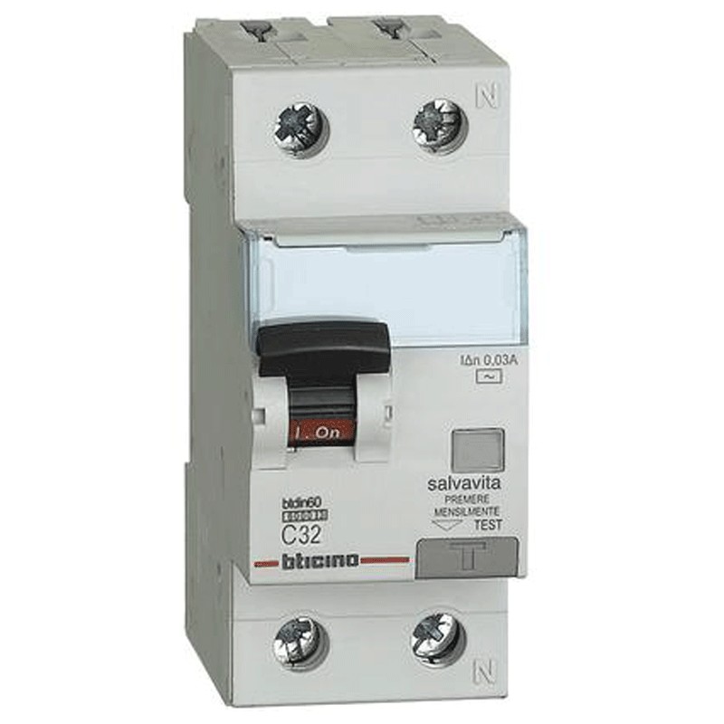 Interruttore magnetotermico differenziale Bticino, 2 moduli, attacco DIN (universale per qualsiasi centralino in commercio), poli 1P+N, 32 ampere, potere di interruzione 6kA, tensione 230 Vac, corrente differenziale Idn 0.03A, tipo AC, curva d'intervento C.
