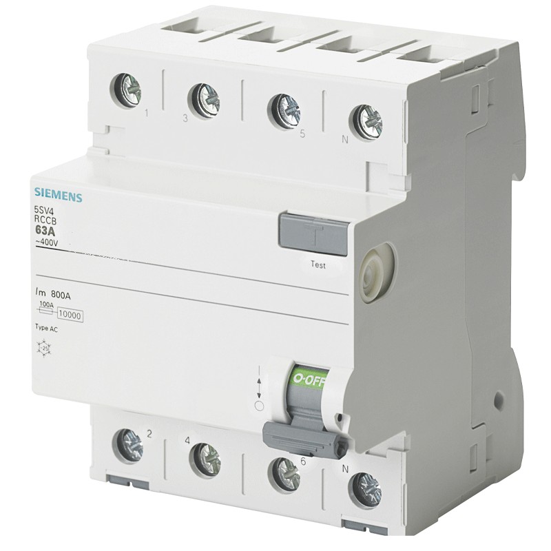 Interruttore differenziale puro (salvavita) Siemens, 4 moduli, attacco DIN (universale per qualsiasi centralino in commercio), poli 4P, 63 ampere, corrente differenziale Idn 300mA, tensione 400 Vac, tipo di differenziale AC.