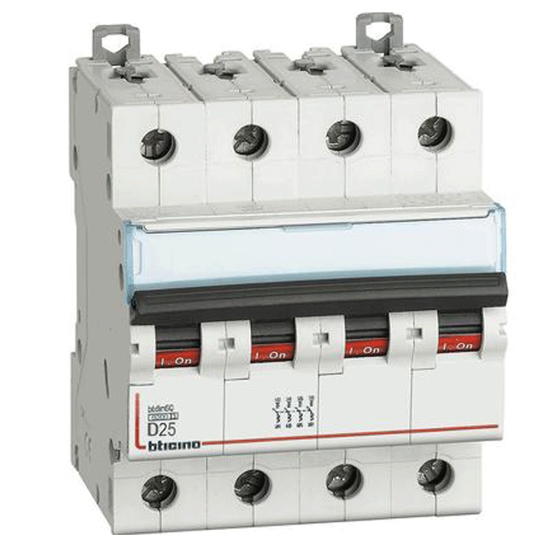 Interruttore magnetotermico Bticino, 4 moduli, attacco DIN (universale per qualsiasi centralino in commercio), poli 4P, 25 ampere, potere di interruzione 6kA, tensione 400 Vac, curva D.