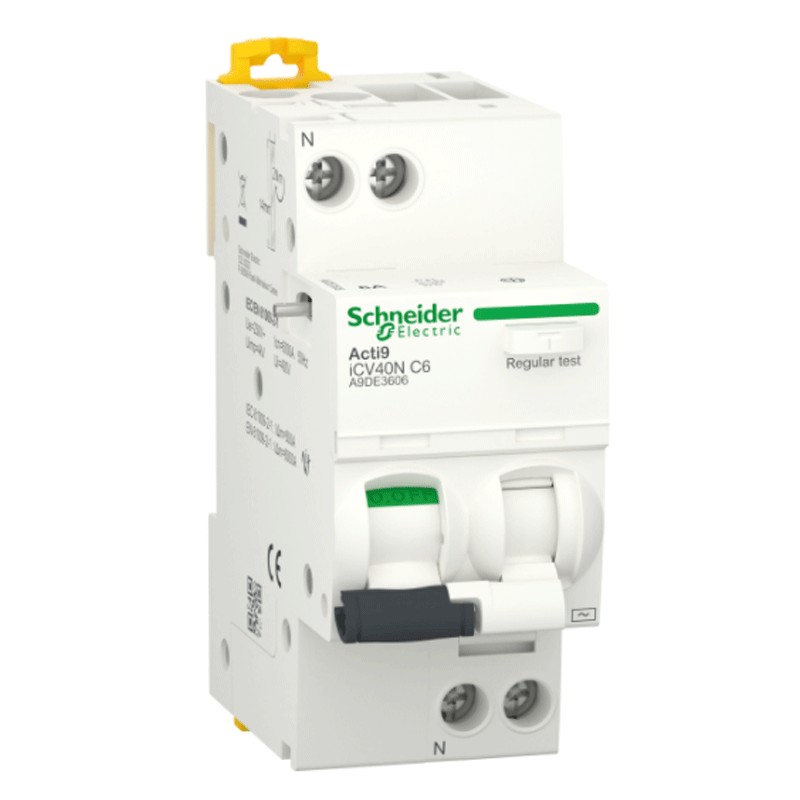 Interruttore differenziale magnetotermico Schneider Acti9 con protezione da sovracorrente (RCBO), posizione neutra a sinistra, attacco DIN (universale per qualsiasi centralino in commercio), 1P+N, 6 ampere, potere di interruzione 6kA, tensione nominale 230 Vac, curva d'intervento C.
