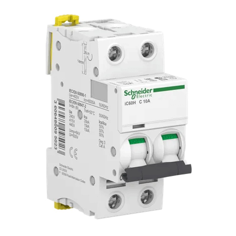 Interruttore magnetotermico Schneider, 2 moduli, attacco DIN (universale per qualsiasi centralino in commercio), 2P, 10 ampere, potere di interruzione 10kA, tensione di isolamento nominale 500 Vac, curva d'intervento C.
