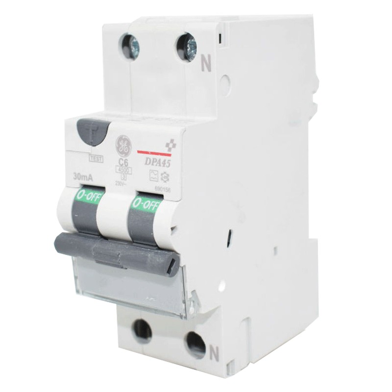 Interruttore magnetotermico differenziale General Electric 2 moduli, attacco DIN (universale per qualsiasi centralino in commercio), 1P+N, 6 ampere, potere di interruzione 4,5kA, tensione 30 mA, corrente differenziale Idn 0,03A, tipo A, curva d'intervento C.