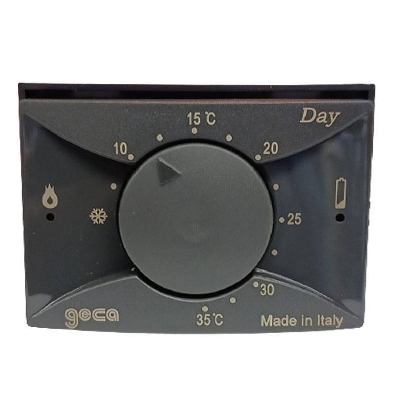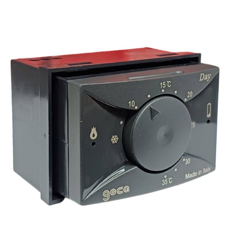 Termostato ambiente Geca Day modello TE527 con funzione estate/inverno, colore antracite, installazione da incasso in scatola 3 moduli 503, con i 4 supporti compresi nella confezione è compatibile con le serie da incasso più diffuse.