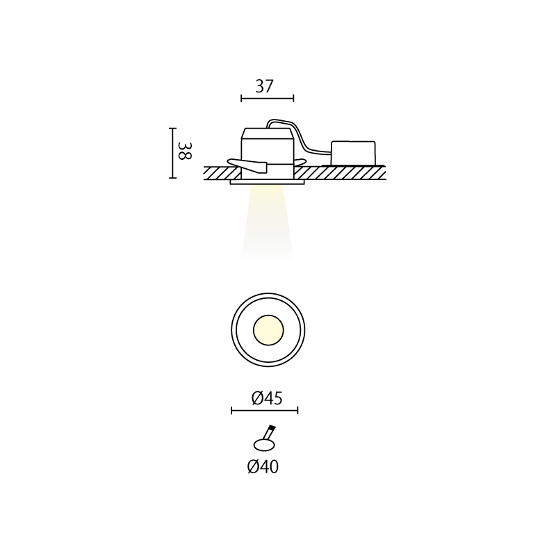 - Spessore faretto: 38 mm