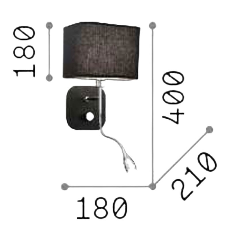 Montatura in metallo verniciato opaco. Paralume con lamina di pvc rivestita in tessuto. Interruttore unico con controllo indipendente delle due sorgenti luminose.