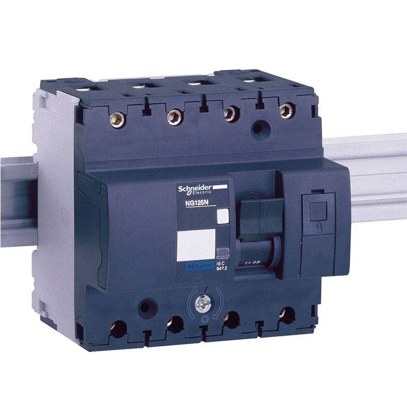 Acti9 NG125N è un interruttore automatico a bassa tensione. È un interruttore 4P con 4 poli protetti, corrente nominale di 100A e curva di intervento D. La capacità nominale di interruzione di cortocircuito arriva fino a 25 kA da 380VAC a 415VAC.