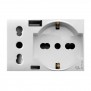 Presa schuko bipasso (UNIVERSALE) più presa std italiano P17/11, prese USB di tipo A e C uscita 5V 3A. Serie Domus colore bianco, 2P+T 10/16A 250V~, con alveoli schermati, non illuminabile - 3 moduli.