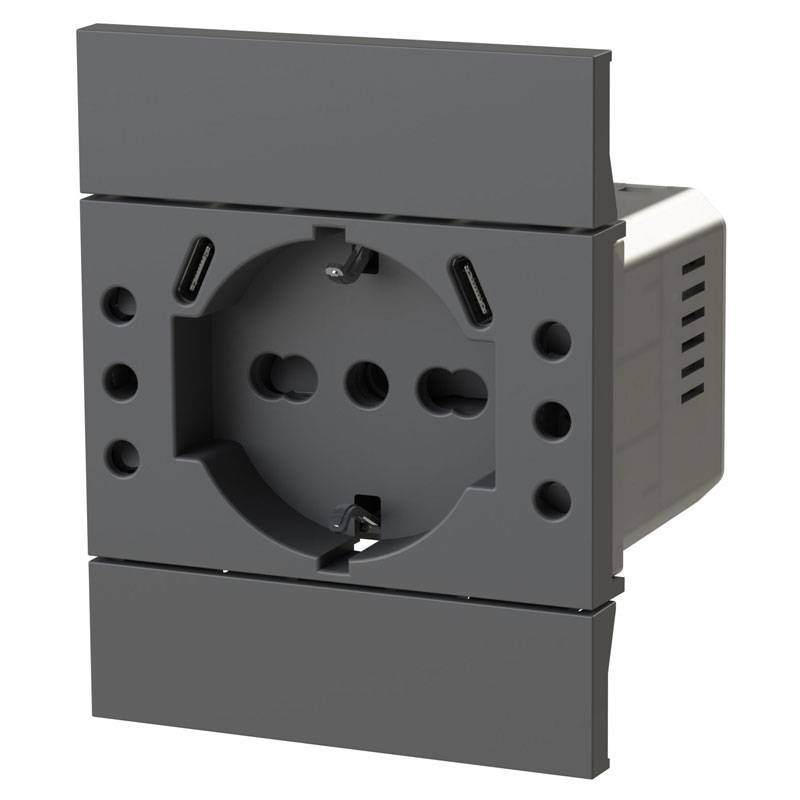 Presa USB 4Box P503 compatibile con la serie Bticino LivingNow Nera, Con 5 prese e un unico morsetto di alimentazione, composta da 2 Prese USB 3A Tipo C, 1 schuko, 2 prese 10A e 1 presa 10/16 A.