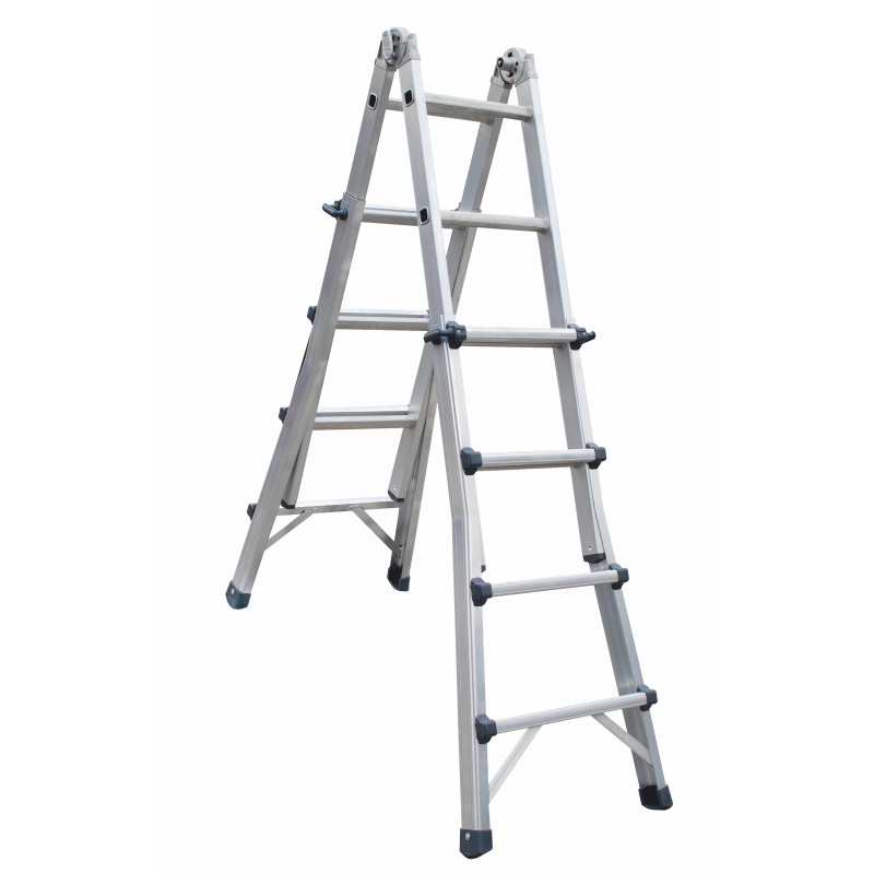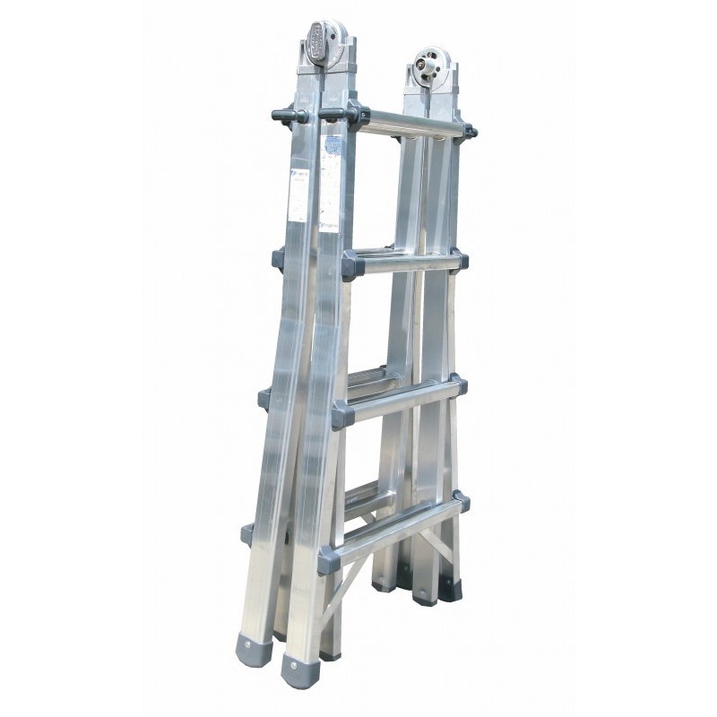 Scala Frigerio a sfilo telescopico rinforzata con cerniera a posizionamento rapido altezza max 5,03 mt (estesa completamente), altezza max cavalletto 2,32 mt - portata max 150Kg, Gradini totali 10+10, peso 17,3Kg, altezza max di lavoro con prolunga 4,32 mt. Cerniera dotata di tappo di protezione meccanismo a molla contro le infiltrazioni dellacqua e la ruggine.