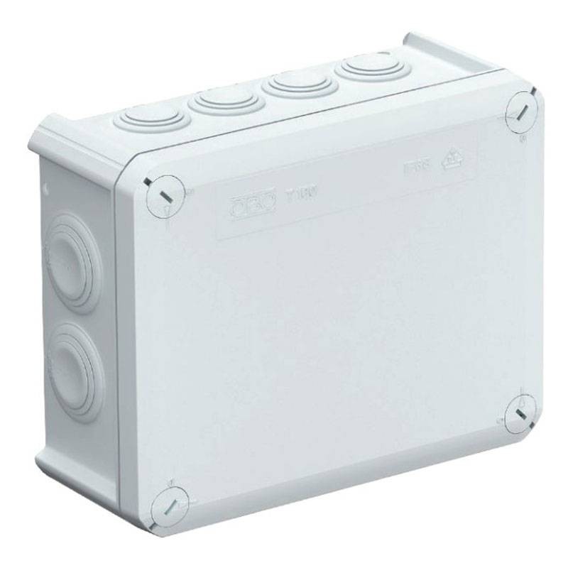 Scatola di derivazione per il collegamento di cavi e linee in ambienti interni ed ambienti esterni protetti. Forma rettangolare senza ingressi. Adatta per il montaggio su pareti e soffitti, il montaggio su lamiere di montaggio e filettatura nel pavimento. Con la possibilità di fissaggio interno e il montaggio su sezioni angolari. Coperchio con chiusura rapida, piombabile. Costruito con materiali privi di alogeni. Scatola di derivazione a norma DIN EN 60670. Antifiamma a norma DIN EN 60695-2-11, temperatura di prova 650 °C. Resistenza all'impatto IK05 a norma DIN EN 50102.