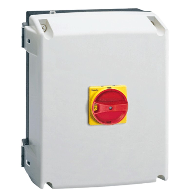 Cassetta vuota Lovato per interruttori sezionatori, con maniglia giallo/rossa.