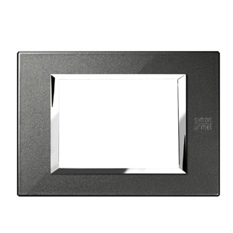 Placca Expì Urmet Simon Nea 3 moduli (frutti, posti) colore nero grafite, realizzata in metallo. Può essere installata solo sul supporto 10703N.